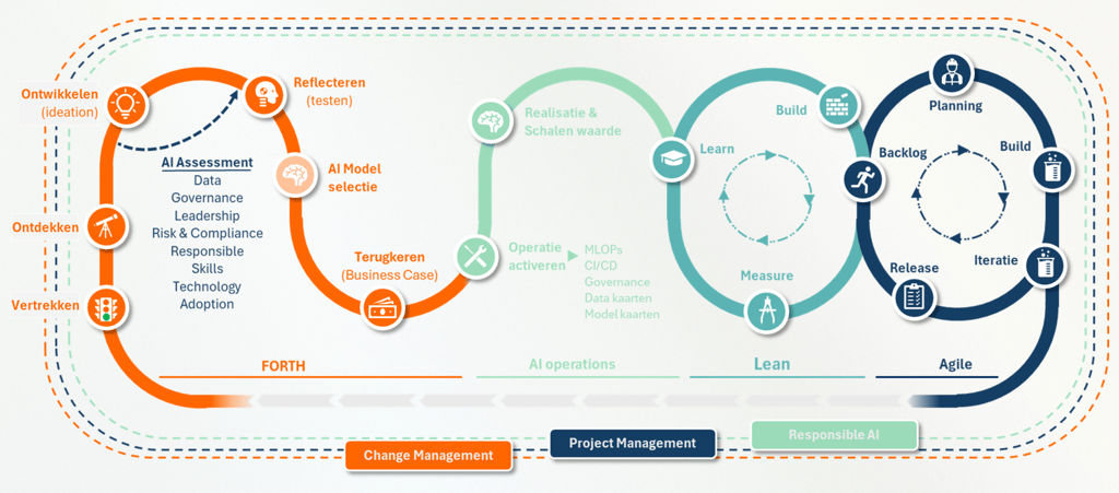 AI-initiatieven falen vaak op het niet scherp krijgen van de use case, datakwaliteit, governance-eisen en daadwerkelijke adoptie. Daarom start ik bij AI-innovatie bewust met de FORTH methodiek om eerst die randvoorwaarden expliciet te maken en te toetsen. Pas als die basis klopt kun je met vertrouwen doorpakken.