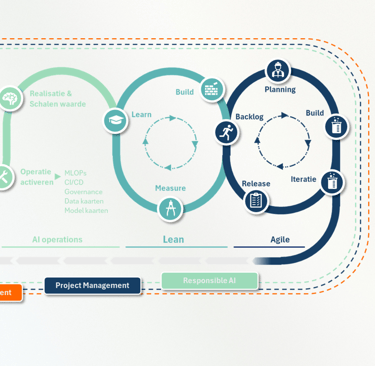 Als onderdeel van de Straightable AI-lifecycle voeren we vroeg in het project een AI-impact assessment uit om vast te stellen of uw organisatie klaar is voor AI. Hierbij wordt niet alleen gekeken naar technologie, maar bovenal ook naar data, governance en mensen. Indien nodig kunnen we hiervoor al verbeteracties starten. Wanneer de richting helder is en we weten wat we gaan bouwen, zorgen we dat het ook echt landt. Voor de operationele fase zijn er meerdere modellen en tools die benodigd zijn om de kwaliteit en performance van de AI-modellen te garanderen. AI-specifieke tools, zoals TRISK en MLOPs, worden ingezet voor een gecontroleerde en betrouwbare implementatie, integratie, beveiliging en monitoring. Continuous Improvement/Continuous Development (CI/CD) wordt gebruikt om codewijzigingen in software continu te integreren, testen en automatisch uit te rollen. LEAN voorkomt dat er in de verkeerde use cases wordt geïnvesteerd. AGILE kan er dan voor zorgen dat onzekerheden reduceert en het geen eenmalige exercitie blijft, maar leidt tot duurzame impact. Bij start van het innovatie traject begint de adoptie al door het kiezen van een divers innovatie team. We maken gebruik van de bewezen methoden (bijv ADKAR) zodat adoptie, gedrag en waardecreatie maximaal worden ondersteund.